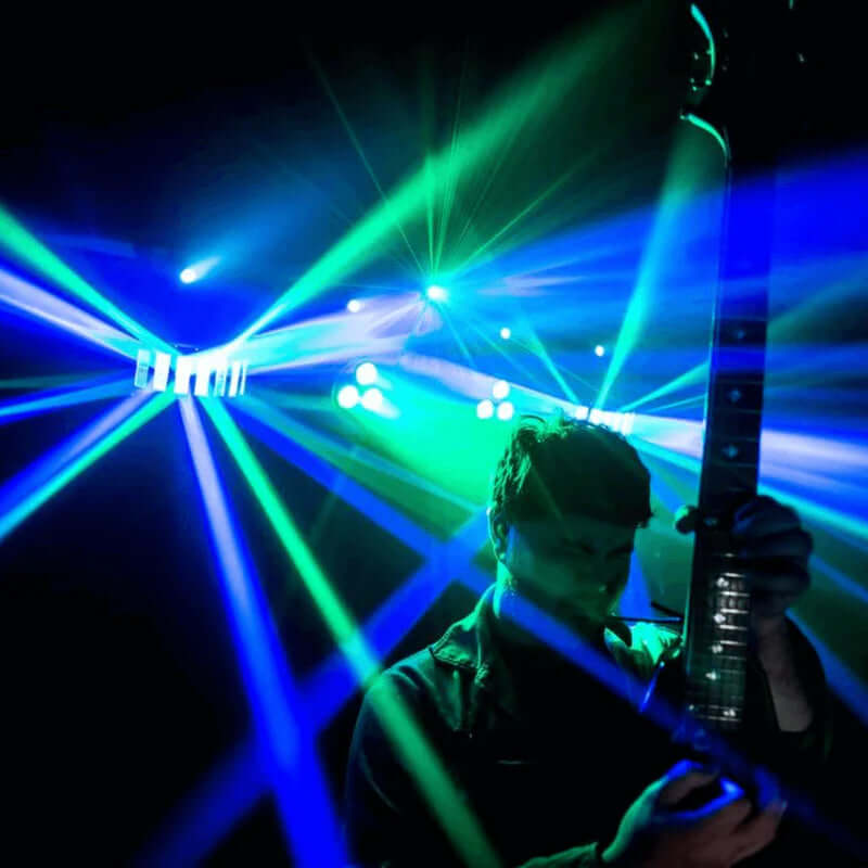 - Pack light comportant 2 Derby Beam à LED, 2 PAR à LED, 4 LED pour effet Strobe et UV et 1 LASER vert et rouge 🌈